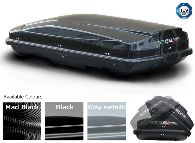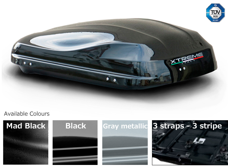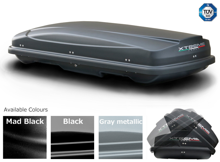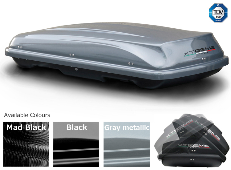 The Xtreme series extinguishes itself by the unique design, the volume and the large choice of different types! These Xtreme roof boxes are made of high-worthy ABS plastics (bottom side) and ABS plastics (upper side) an UV protection layer, to avoid color fading. Upper 450l- boxes are supplied with Double-Action spring jacks, high-quality locks and in the lower shell integrated strenghtening and adjusment rails. All Xtreme roof boxes are Tüv approved for a maximum load of 50kg.